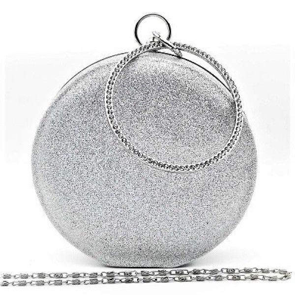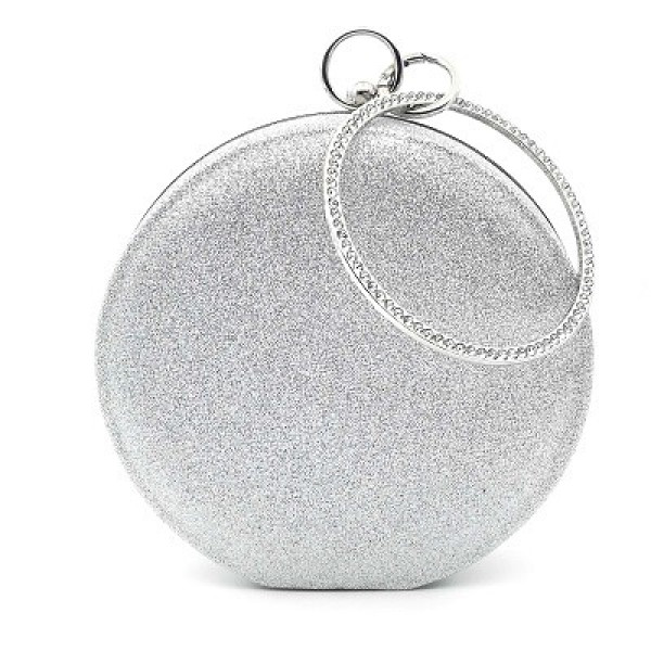 Клъч чанта в сребрист цвят кръгла със сребърен кант, дълга дръжка тип синджир и допълнителна твърда дръжка кръгла с бели циркониеви камъчета. Подходяща за абитуриентски бал, сватба, вечерно излизане на бар или дискотека.