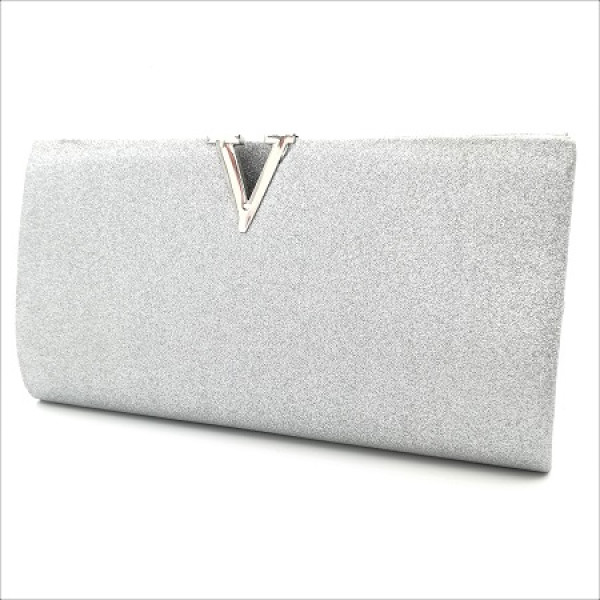 Официална дамска чанта клъч сива( сребриста ) обсипана със ситен брокат , декорирана с буквата V.