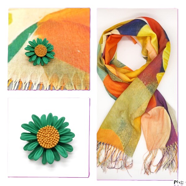 Подарък за жена –Комплект шал в свежи цветове и брошка Цвете
