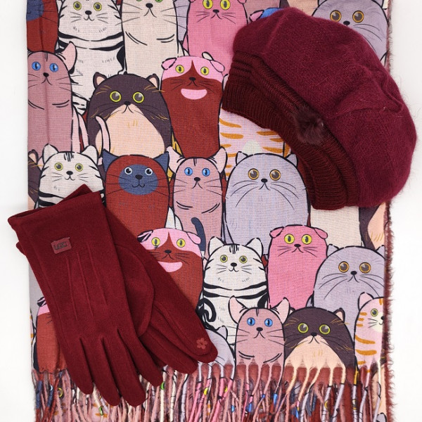 Стилен дамски комплект с котки-Шал, шапка и ръкавици в бордо