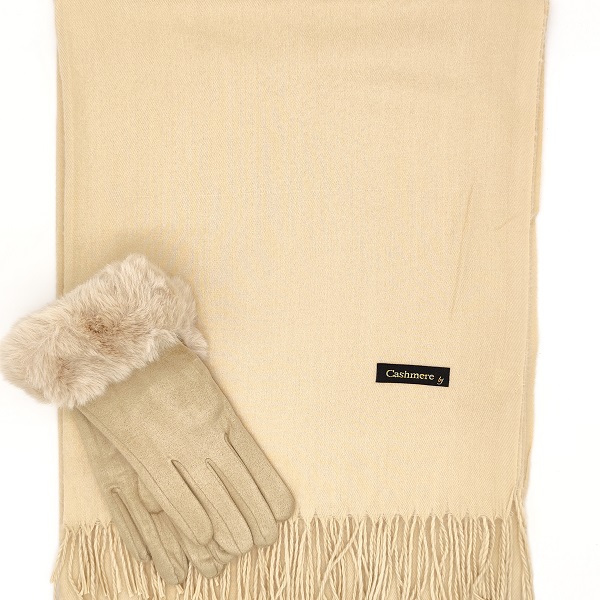 Мек и елегантен дамски комплект шал и ръкавици в бежово, подходящ за студените зимни дни. Универсален и изискан избор, който се комбинира лесно с всяко палто или яке. Идеален като подарък за жена за рожден ден, имен ден или празниците.