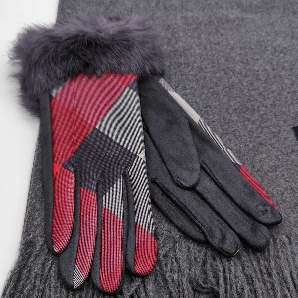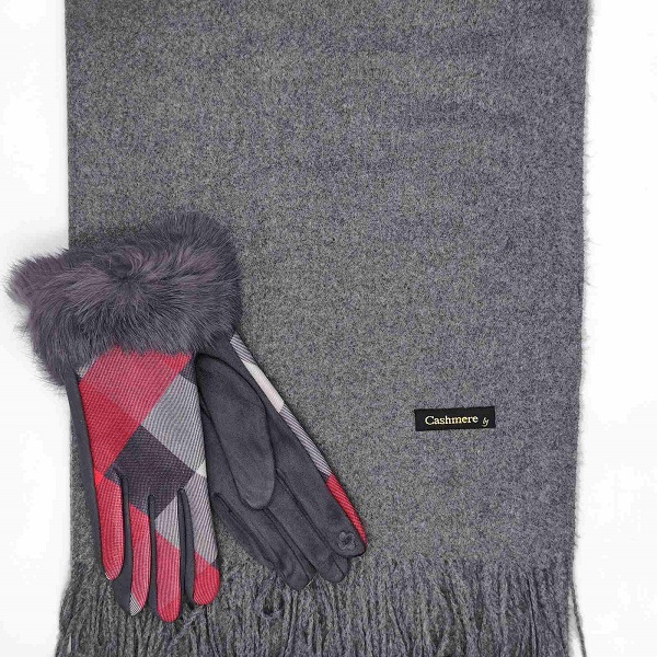 Дамски зимен комплект – кашмирен шал и ръкавици с естествен пух в сиво