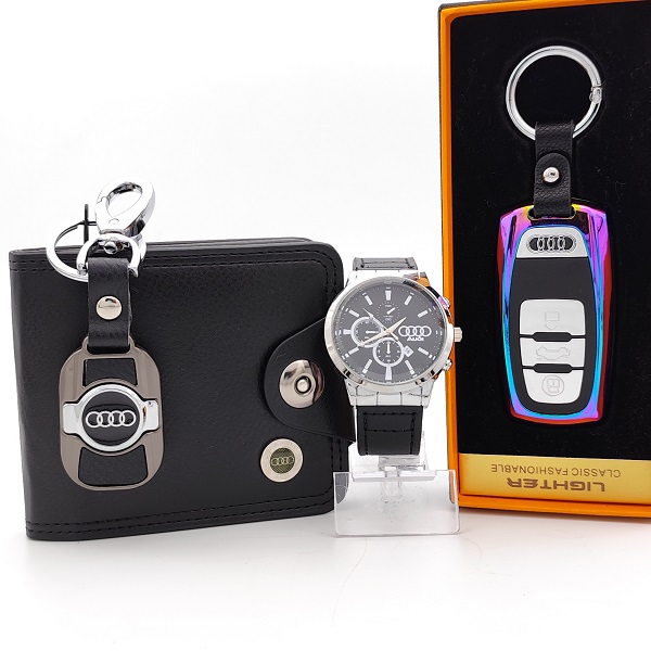 Марков комплект Ауди аксесоари, който съчетава стил и практичност – подходящ избор за подарък за всеки мъж, почитател на марката Ауди. Включва часовник, портфейл, ключодържател и електрическа запалка, изработени с внимание към всеки детайл.