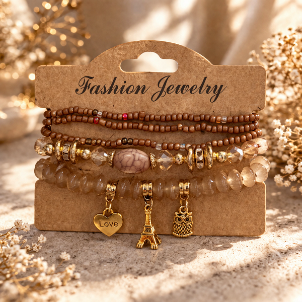 Стилна дамска гривна в топли земни тонове с комбинация от кафяви мъниста, кристали и златисти декоративни елементи. Акцентът са красивите висящи висулки – сърце “Love”, Айфелова кула и бухал, които придават оригиналност и индивидуален стил.