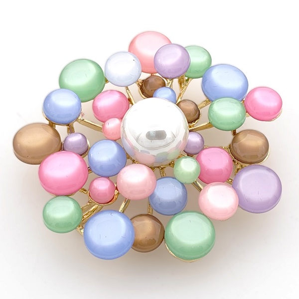 Изискана брошка с цветни перли в нежни пастелни тонове, която впечатлява с мекота и изящество. Разноцветните елементи са разположени в хармоничен дизайн с златист обков, създаващ усещане за лукс и женственост.