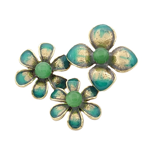 Елегантна брошка с три цветя в комбинация от зелено и златисто, създадена за дамите, които обичат да подчертават стила си с изтънчени детайли. Всяко цвете е с фино изработени венчелистчета и център в зелен нюанс, придаващ усещане за свежест и хармония.