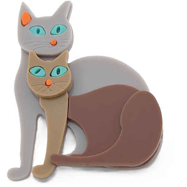 Брошка две котки в елегантна комбинация от сиво и кафяво. Изработена от качествен полимерен материал с фини детайли и сигурно закопчаване тип безопасна игла, тя е чудесен аксесоар за  дрехи или шалове.