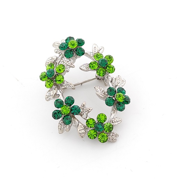 Изискана брошка с форма на венец от цветя, обсипана с блестящи зелени камъни и изящен сребрист обков. Съчетава нежност и стил, като придава на тоалета изтънчено излъчване и свеж акцент.