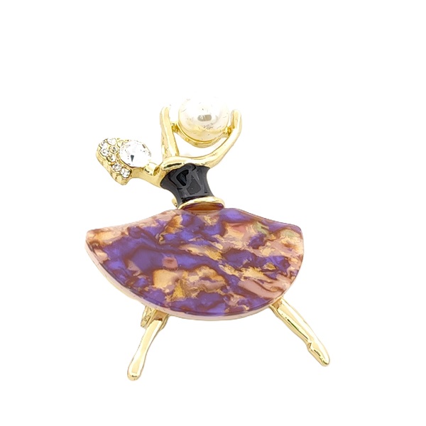 Изящна брошка във формата на балерина, която съчетава нежност и стил. Акцентът с перла и кристали подчертава фината изработка, а люляковата пола в комбинация със златисти детайли придава изтънчено и женствено излъчване.