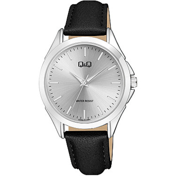 Дамски ръчен часовник Q&Q с черна кожена каишка.
