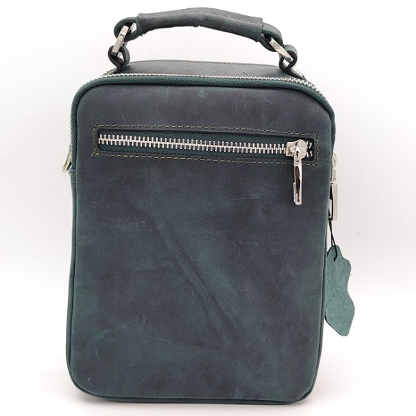 Мъжка чанта през рамо с компактна форма и изчистена визия, изработена от висококачествена естествена кожа с интересен ефект в тъмно зелено. Практична и стилна – подходяща както за ежедневна употреба, така и за подарък.