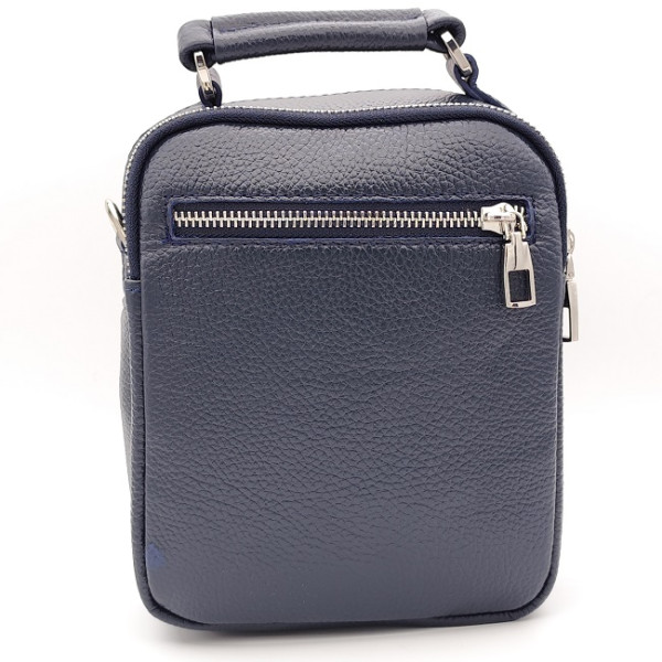 Мъжка кожена чанта през рамо – тъмносиня, с 4 джоба и сребристи ципове