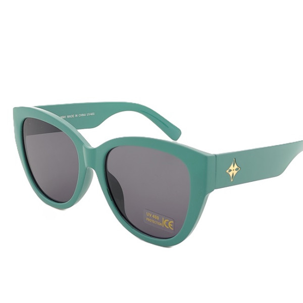 Евтини дамски слънчеви очила с модерен дизайн и красив тюркоазен цвят, които съчетават стил и защита на достъпна цена. Моделът е декориран със златист елемент в основата на дръжките и разполага със сиви стъкла с UV400 защита, които предпазват очите от вредните лъчи.