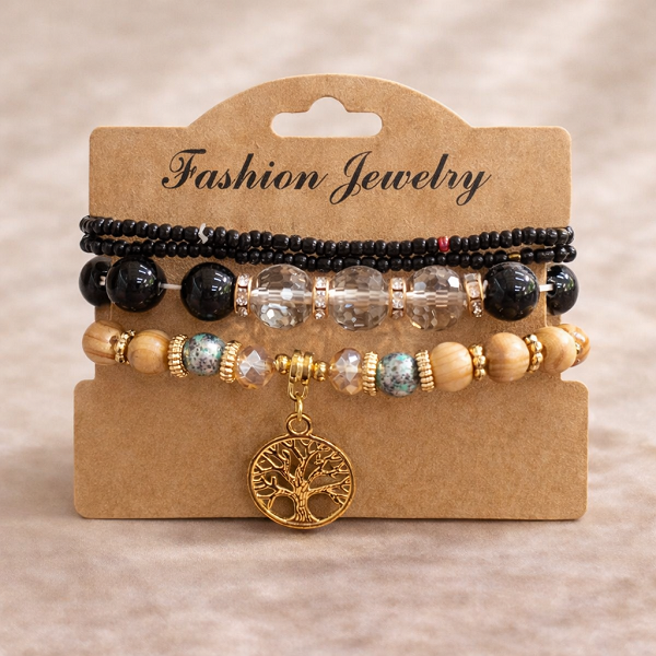Модерна дамска гривна с елегантна комбинация от черни мъниста, прозрачни кристали и топли дървесни елементи. Завършекът е изящната висулка дърво на живота, която символизира стабилност, енергия и хармония.
