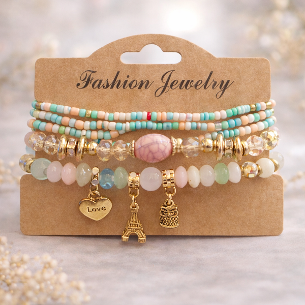 Красива дамска гривна с комбинация от пастелни мъниста в нежни нюанси, допълнени от кристали и златисти елементи. Моделът се отличава с интересни висящи висулки – сърце “Love”, Айфелова кула и декоративен елемент, които придават индивидуалност и стил.