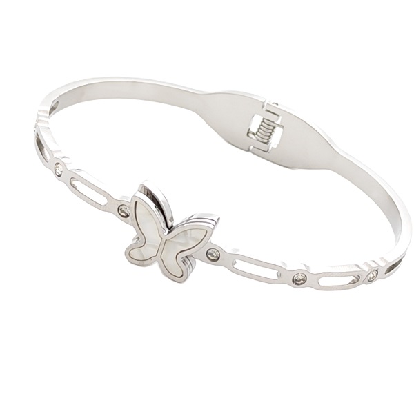 Нежна и елегантна дамска гривна от медицинска стомана в сребрист цвят с декоративна пеперуда от седеф и малки вградени кристали по дължината.