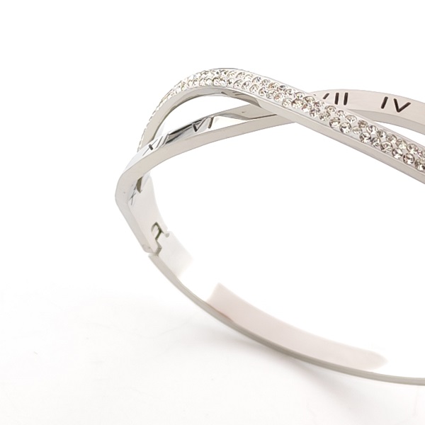 Изискан и луксозен модел дамска гривна от медицинска стомана със сребрист цвят и оригинален дизайн с римски цифри. Елегантната плетка е украсена с два реда бели циркониеви камъни, които придават нежен блясък и подчертават ръката с финес.