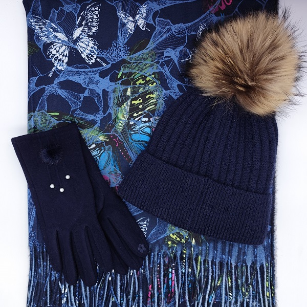 Комплект кашмирен шал шапка с пух и ръкавици с копчета-Дамски зимен комплект