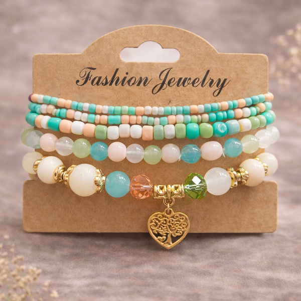 Свежа и стилна дамска гривна с комбинация от пастелни мъниста в нежни нюанси на зелено, тюркоаз и бежово. Декоративните кристали и златистите елементи придават елегантност, а фината висулка сърце завършва визията с романтичен акцент.