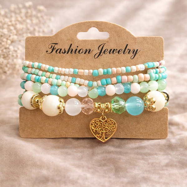 Стилна дамска гривна с комбинация от тюркоазени, зелени и бели мъниста, допълнени от фини кристали и златисти акценти. Акцентът е красивата висулка сърце, която придава романтично и модерно излъчване.