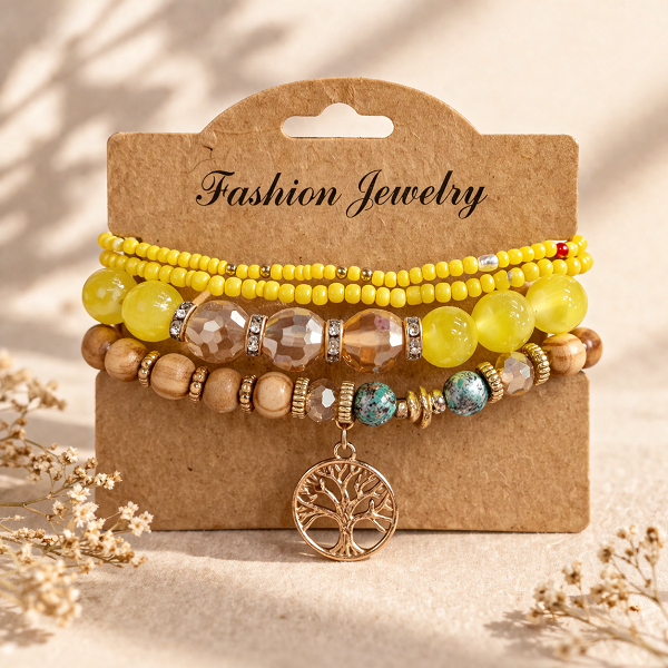 Енергична и цветна дамска гривна с комбинация от жълти мъниста, декоративни елементи в топли нюанси и стилна висулка дърво на живота. Моделът носи усещане за свежест, позитивизъм и баланс, като същевременно е лесен за съчетаване с ежедневни визии.