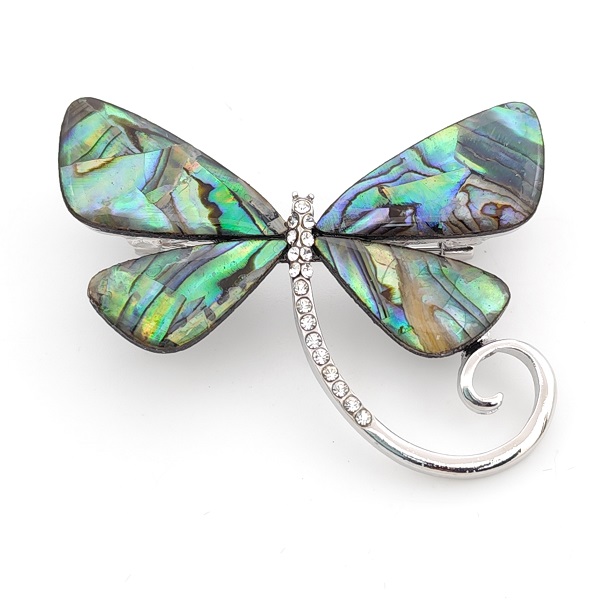 Изящна дизайнерска брошка с кралски седеф, която впечатлява със своите неповторими многоцветни отблясъци. Изработена е от бижутерийна сплав със сребрист обков и закопчаване тип безопасна игла, което гарантира стабилност и удобство при носене. Елегантният дизайн във форма на пеперуда я прави подходяща за палто, сако или друг вид горна дреха.