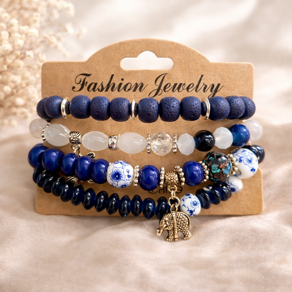 Стилна дамска гривна с наситени сини мъниста и ефектни декоративни елементи, допълнена с красива висулка слонче – символ на късмет, сила и благополучие. Дизайнът съчетава класика и модерна визия, подходяща за всяка жена.