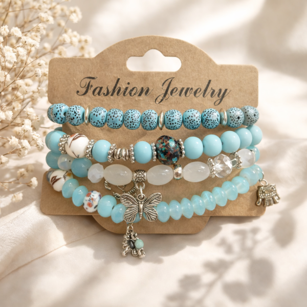 Дамска гривна с елегантно съчетание от светло сини мъниста и нежна метална висулка пеперуда, която придава лекота и стил на визията. Моделът е подходящ както за ежедневие, така и за по-специални поводи.