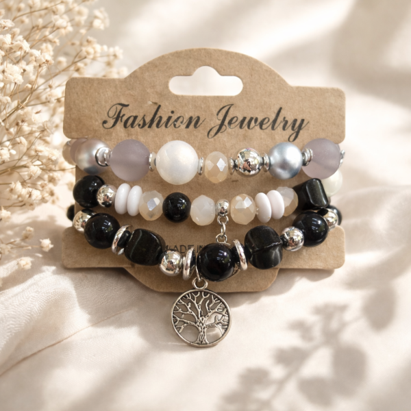 Стилна дамска гривна, съчетаваща черни и бели мъниста с елегантни метални елементи и впечатляваща висулка дърво на живота – символ на сила, баланс и ново начало. Моделът е универсален и лесно се комбинира както с ежедневни, така и с по-елегантни визии.