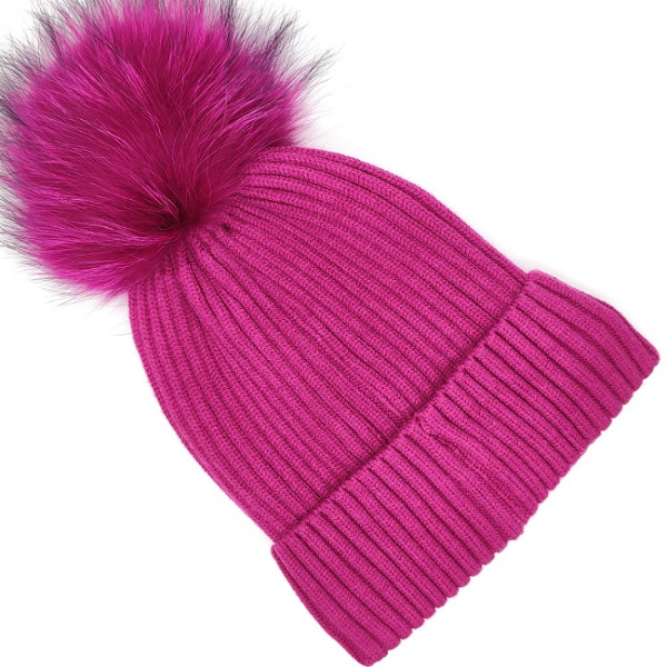 Дамска зимна шапка с пух о естествен косъм и подгъв-Цикламена