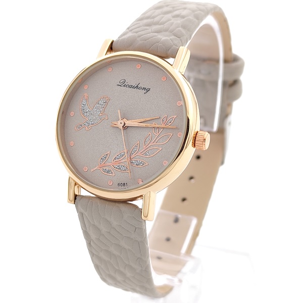 - Сив циферблат с красиво изобразена птица и клонка, нежно обсипани с брокат, добавящи деликатен блясък и уникален акцент.