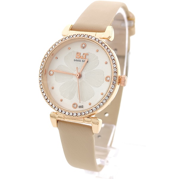 Дамски часовник в бежово с цвете и камъни