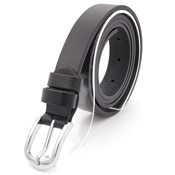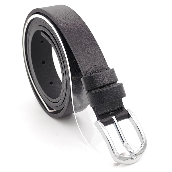Дамски колан от естествена кожа черен тънък с обла сребриста катарама
