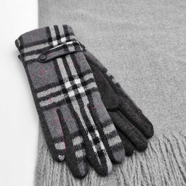 Дамски комплект – сив кашмирен шал, барета и ръкавици на каре