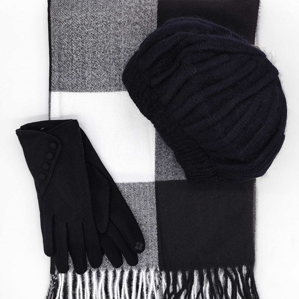 Дамски комплект – кашмирен шал в черно и бяло, барета и ръкавици