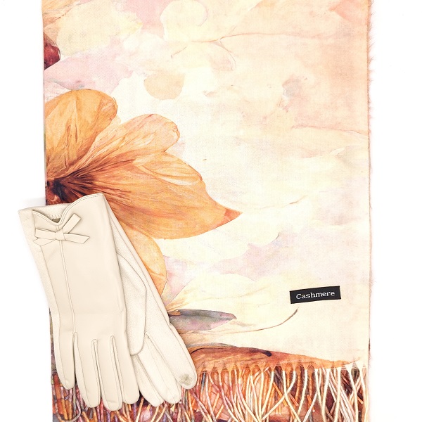 Комплект шал и ръкавици в екрю с декоративна панделка-Луксозен подарък за жена