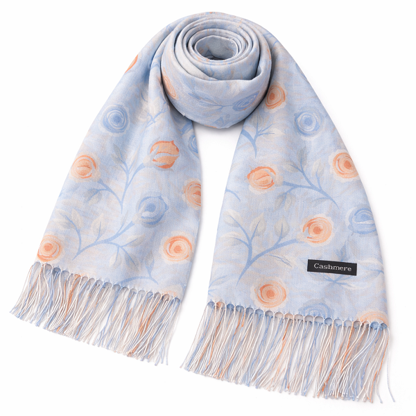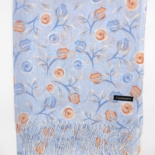 Дамски тънък шал в синьо с цветя и дълги ресни