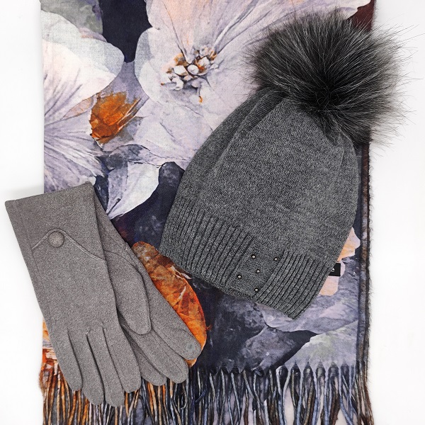 Комплект шапка, шал и ръкавици в сиво с флорален шал – елегантен зимен подарък за жена