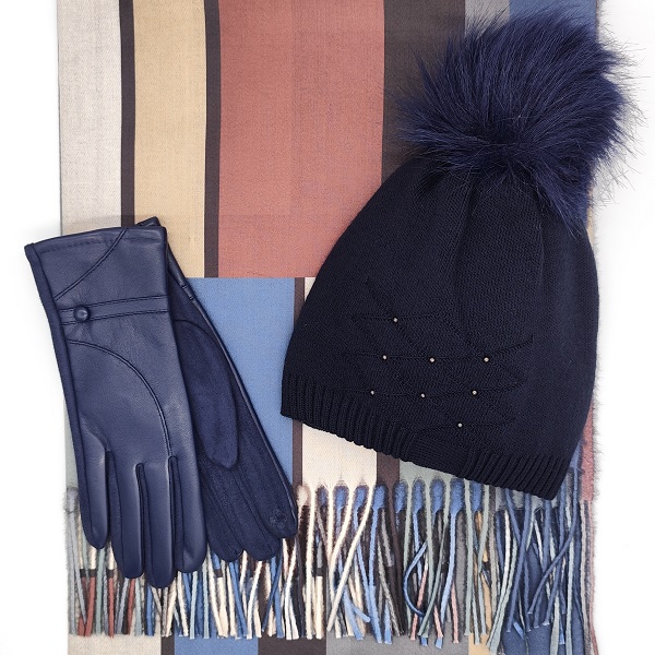 Дамски зимен комплект – шапка с пух, шал и кожени ръкавици в тъмносиньо