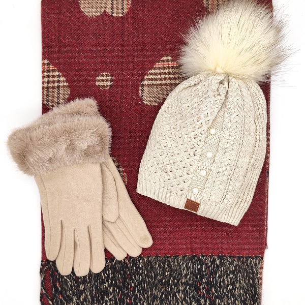 Дамски комплект шапка шал и ръкавици в бежово и бордо – топла и елегантна комбинация, създадена за комфорт и стил през студените дни. Изработен от плътен кашмир, този комплект е перфектен избор за ежедневието или като луксозен подарък за жена за рожден ден, имен ден или Коледа.