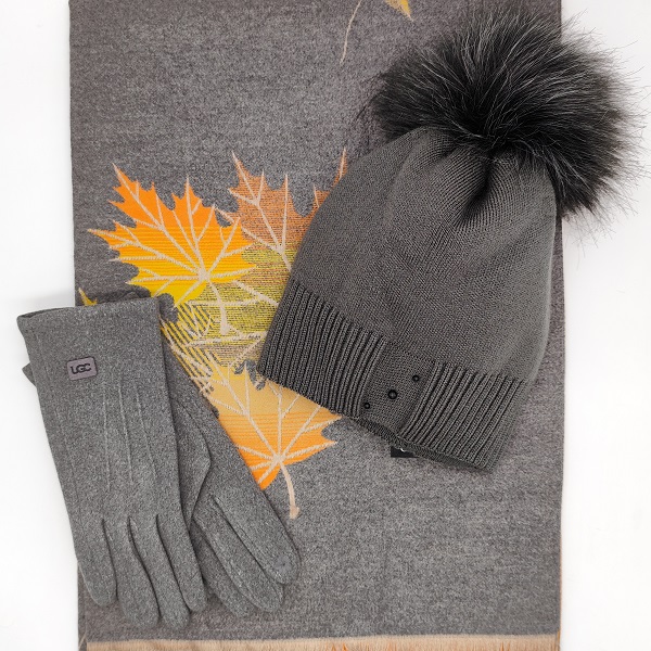 Дамски зимен комплект в сиво с листа-Шал, шапка и ръкавици