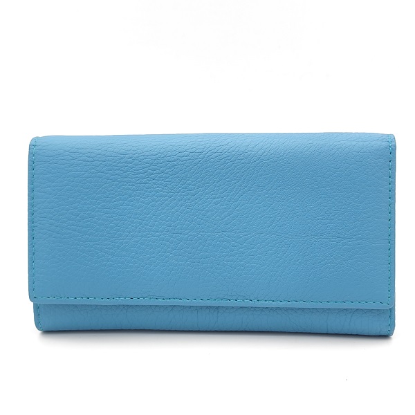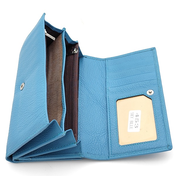 Дамско портмоне от естествена кожа светло синьо с много отделения за карти