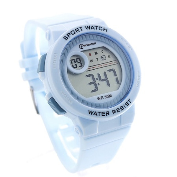 Детски часовник за момче в светло син цвят с електронен циферблат и много функции. Практичен подарък за всяко подрастващо момче на изгода цена.