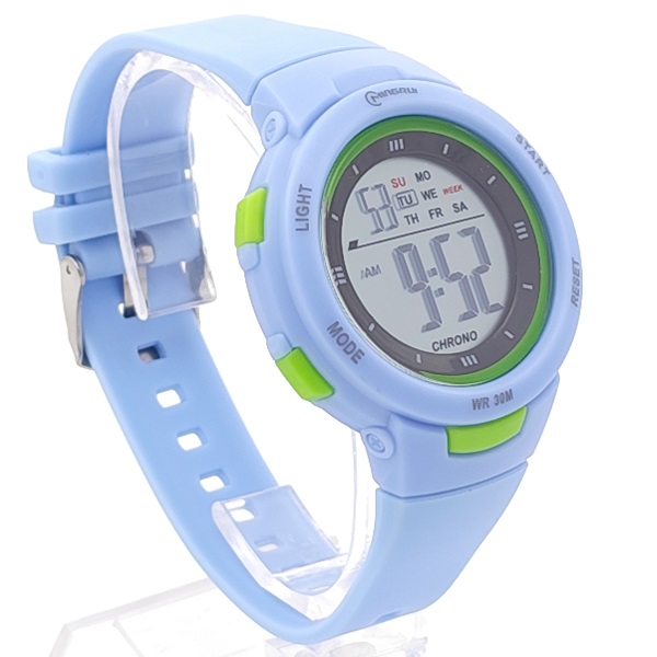 Практичен и удобен детски електронен часовник за момче в свежа комбинация от светло синьо и зелено. Моделът е със силиконова каишка, която е мека и комфортна за носене през целия ден. Дигиталният дисплей показва часа ясно и лесно, а часовникът е подходящ както за училище, така и за ежедневие. Отличен избор, ако търсите детски часовници за момчета на добра цена.