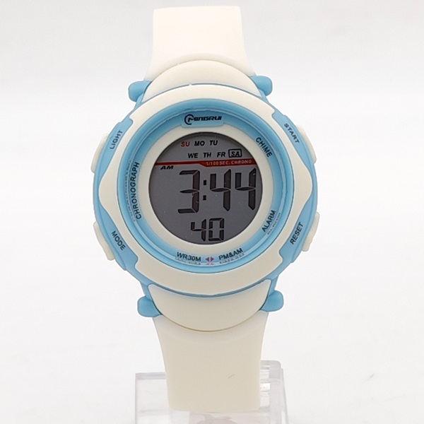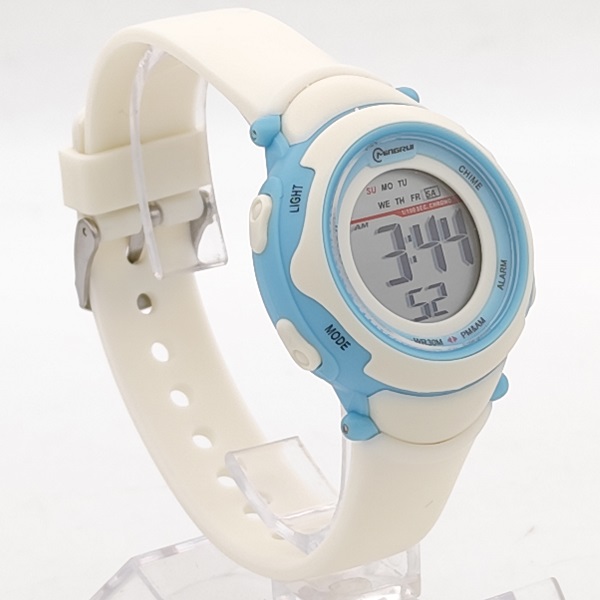 Стилен детски ръчен електронен часовник в комбинация от бяло и светло синьо, подходящ за момчета и момичета. Моделът е със силиконова каишка, която е мека и комфортна за носене през целия ден. Дигиталният дисплей показва часа ясно, а часовникът разполага с функции като аларма, хронометър и дата, което го прави практичен за училище и ежедневие. Отличен избор, ако търсите детски часовници на добра цена.
