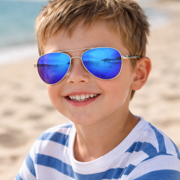 Тези детски слънчеви очила авиатор с поляризация са перфектен избор за силно слънце и активни игри навън. Моделът е със стилни сини огледални стъкла, които придават модерна визия и допълнителен комфорт при ярка светлина.