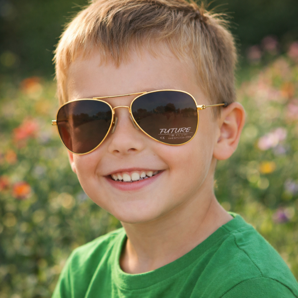 Тези детски слънчеви очила бъбрек с поляризация се отличават със стилна златиста метална рамка и топли кафяви стъкла, които осигуряват комфорт при ярка светлина. Класическият дизайн тип „авиатор“ стои модерно и удобно на детското лице.