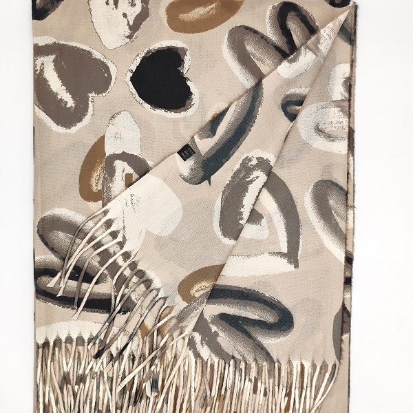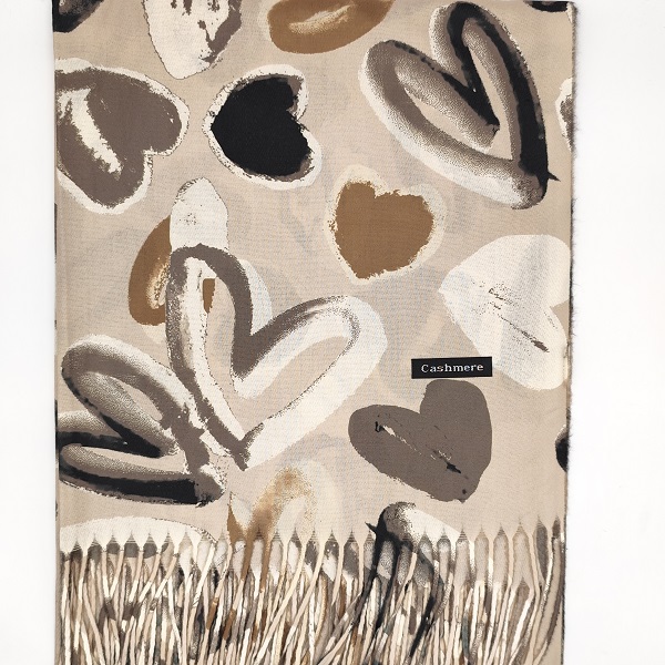 Стилен и нежен дамски кашмирен шал в бежов нюанс, декориран с ефектни сърца в черно, бежово и кафяво. Меката и топла материя от кашмир осигурява комфорт през студените дни, а дългите ресни по краищата придават допълнителна елегантност и движение. Универсалният цвят и изразителният десен правят този шал подходящ както за всекидневна визия, така и за по-специални поводи.