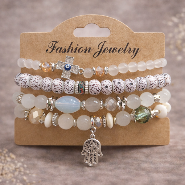Елегантна дамска гривна с бели мъниста, кръст и ръката на Фатима