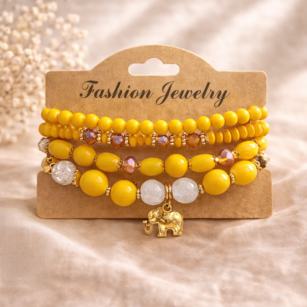 Красива дамска гривна с наситени жълти мъниста, комбинирани с фини кристални елементи и стилни златисти детайли. Акцентът е нежната висулка слонче, символ на късмет и благополучие, която придава завършен и отличителен вид.